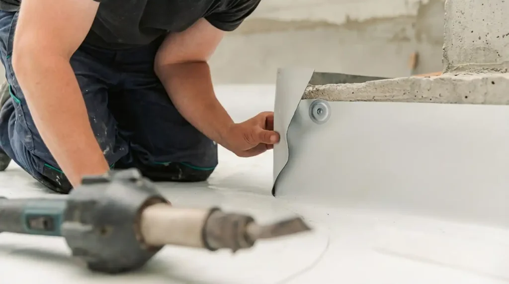 Les joints de la membrane sont soudés à l’air chaud, ce qui crée une liaison solide entre les sections de membrane. Cette technique réduit les risques d’infiltration d’eau et assure une étanchéité durable.